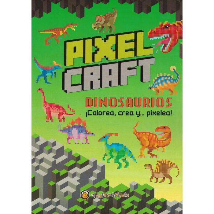 Libro de actividades inspirado en universo pixelado con dinosaurios y desafios creativos.