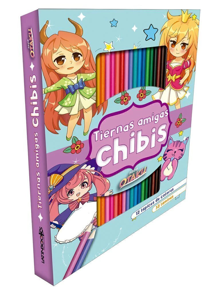 Set creativo que incluye libro para colorear con personajes estilo chibi y 12 lapices de colores. Inspirado en estetica otaku y cultura kawaii.